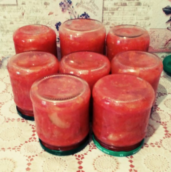 Описание: "ТЕЩИН ЯЗЫК" из кабачков. 3 кг кабачков очистить от кожуры и семян,нарезать тонкими пластинами. (я тру на терке для капусты )100грамм чеснока,5-6 сладких перцев,1-2 горьких перца пропустить через мясорубку. Всё это дело складывается в кастрюлю,добавляем 0.5кг томатной пасты, 1стакан растительного масла,2столовые ложки соли и сахар по вкусу. Варить 40-45 минут. В конце варки добавить 100грамм 9% уксуса. Разложить по банкам и закатать.По вкусу похоже на острое лечо.