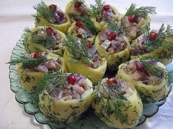 Описание: Закуска из селедки и картошкиЭто блюдо которое произведет настоящий фурор на вашем праздничном столеИнгредиенты:картофель 10 штук;лук 1 головка;селедка 2 штуки;растительное масло 100 миллилитров;горчица 1 столовая ложка;лимон 1 штука;зелень для украшения;зерна граната для украшения;соль- по вкусу;лавровый лист 2 штуки.Для начала для приготовления нашего блюда хорошо помойте картофель и поставьте вариться в мундире. Добавьте соль по вкусу и лаврушку.Пока наш картофель варится, займемся селедкой. Отрежьте голову, хвост и плавники.Очистите от внутренностей и удалите хребет и мелкие косточки. По желанию можете очистить и от шкурки.Готовое филе нарезаем маленькими кубиками.Лук чистим, шинкуем мелкими кубиками, добавляем к селедке.Для заправки разрезаем лимон пополам, и с одной половины выдавливаем сок, добавляем растительное масло и горчицу, все тщательно перемешиваем и добавляем к селедке.Готовый картофель остужаем и очищаем от кожуры. Срежьте верхушку, и при помощи чайной ложки удалите сердцевину.Фаршируем картофель готовой начинкой.Сверху украшаем зернами граната и нарезанной зеленью