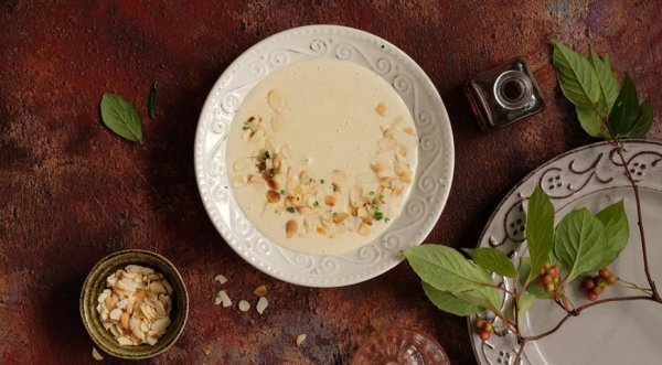 Описание: 4 фунта* постной говядины или телятины1/2 целой шеи барашка1/2 фунта сладкого миндаля1 унция** длинной вермишелижелтки 6 яиц1/4 пинты*** самых жирных сливок4 лепестка мускатного цвета6 бутонов гвоздикичуть больше 2 кварт**** водыСварите говядину и баранину в полностью покрывающей их воде, чтобы тихонько кипела, пока бульон не будет очень крепким, а мясо чрезвычайно мягким. Затем процедите бульон и верните на огонь вместе с вышеозначенным количеством вермишели, мускатного цвета и гвоздики, пусть варится, пока не наполнится ароматом специй.К тому времени пусть будут готовы: миндаль – бланширован и истолчен в ступке как можно тоньше; желтки яиц – сварены вкрутую. Продолжайте толочь миндаль вместе с желтками, очень понемногу подбавляя суп, дабы последний не получился маслянистым. Истолките в пасту. Затем понемногу, порциями, добавьте остальной суп, чтобы все полностью перемешалось.Чтобы суп стал совершенно гладким, смешивайте его остывшим. Процедите суп через тонкое сито и поставьте на огонь. Нагрейте, часто помешивая, подавайте горячим. Прямо перед тем как подать, влейте сливки.*фунт = 454 г**унция = 28,4 мл***пинта = 568 мл****кварта = 1,13 л