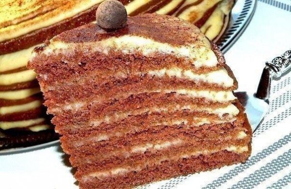 Описание: ИНГРЕДИЕНТЫ: кефир 500 мл сахар 400 гр яйцо 2 шт мука 380 гр сода 2 ч.л разрыхлитель 10 гр какао 8ст.лкрем: молоко 800 мл сахар 8 ст. л мука 5 ст.л яйцо 1 шт масло сливочное 30 грПРИГОТОВЛЕНИЕ:В кефир добавить соду и хорошо перемешать. Затем добавить сахар и яйца. Всё хорошо перемешать. Добавить просеянную муку, разрыхлитель и какао. Хорошо перемешать. Тесто получится, гуще чем сметана. Выпекать тонкие коржи (у меня получилось 7 шт.) Сделать заварной крем: соединить сахар, яйцо, муку, молоко. Хорошо перемешать и поставить на огонь. Довести до кипения при помешивании. Когда крем загустеет, снять с огня, добавить сливочное масло и хорошо взбить миксером. В крем можно добавить ванильный сахар. Крем хорошо остудить. Готовые коржи промазать кремом. Верх торта посыпать какао. Поставить наш тортик в холодильник на ночь. Приятного чаепития!