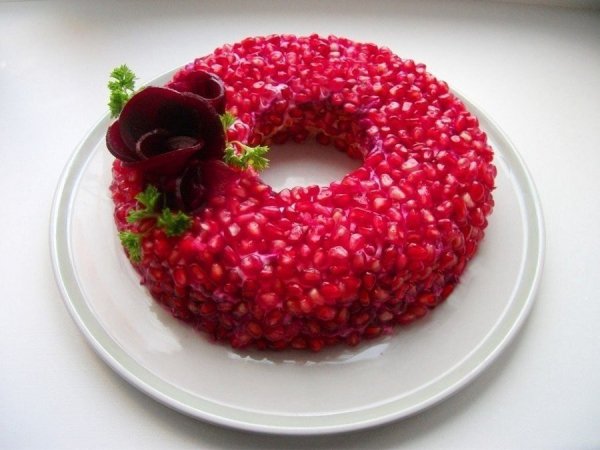 Описание: Гранатовый браслетИнгредиенты:свекла - 2 штлук репчатый - 1 шткартофель - 3 штморковь - 2 шткопченый или отварной окорок курицы - 200 гр, гранат - 1-2 штгрецкие орехимайонезсольПриготовление:Свеклу, морковь, картофель отварить. Отваренные овощи потереть на крупной терке в отдельные миски.Куриное филе порезать соломкой или кубиками.1-й слой: картофель чуть-чуть соли, смазать майонезом2-й слой: морковь чуть-чуть соли , майонез3-й слой: грецкие орехи4-й слой: окорок курицы , майонез5-й слой: лук(можно жареный)6-й слой: свекла , майонез7-й слой: гранат