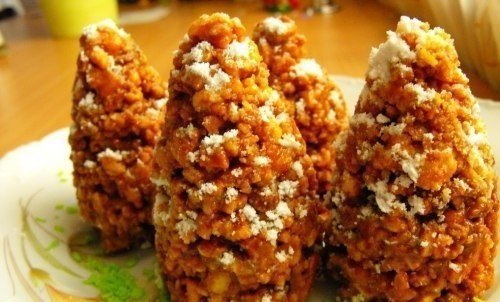 Описание: Вам потребуется:Яйцо куриное 1 шт.Масло сливочное 125 гр.Сахарный песок 4 ст. ложкиМука пшеничная высшего сорта 3 стаканаМолоко 4 ст. ложкиГрецкие орехи 100 гр.Вареное сгущенное молоко 1 банкаСахарная пудра 2 ст. ложкиКак готовить:1. Сахар с яйцом растереть в миске, после чего добавить растопленное на огне в сотейнике или микроволновой печи сливочное масло. Вливаем в массу молоко и тщательно венчиком или ложкой смешиваем все ингредиенты. Далее небольшими порциями всыпаем ранее просеянную муку и замешиваем однородное упругое тесто. Его необходимо тщательно вымесить и разделить на 3-4 части. Каждый кусок теста обворачиваем в пищевую пленку и отправляем в морозильную камеру минут на 30-40. За это время тесто должно хорошо заморозиться.2. Противень устилаем бумагой для выпечки. Духовку разогреваем до температурного режима в 160 градусов. Далее извлекаем тесто из морозилки и натираем его на крупную терку. Данные хлопья помещаем в небольшой слой на противень и отправляем в жаровню на 10 минут. Возможно, тесто придется печь в несколько этапов, так как не стоит делать сильно большой слой в один заход.3. Измельчаем ножом грецкие орехи в крупную крошку. Ничего страшного, если она будет разных размеров и формы, это даже лучше. Испеченное тесто смешиваем с измельченными орехами и вареной сгущенкой. Тщательно смешиваем ингредиенты.Далее зауженные к низу фужеры немного смачиваем внутри водой и ложкой закладываем массу, немного утрамбовывая содержимое. Далее переворачиваем рюмку и немного ее трясем, чтобы печенье выскочило из нее. В общем, если вы делали в детстве пасочки из песка, то у вас это получится с особой легкостью, ведь принцип один и тот же.4. Готовое печенье выкладываем на блюдо, после чего посыпаем сахарной пудрой, которая внешне очень напоминает снег, а также обогащает десерт дополнительной сладостью. Подаем печенье на праздничный новогодний стол в качестве тематической выпечки или же просто в обычный день к чаю. А почему бы и нет, тем более, что печенье легкое в приготовлении и невероятно вкусное.Приятного Вам аппетита!Советы: Можно взять изначально вареную сгущенку, которая продается в магазине, а можно и обычную сварить. Для этого банку обычной сгущенки прямо в закрытом виде помещаем в кастрюлю и полностью покрываем водой. Ставим ее на медленный огонь и в таком виде варим 60 минут, периодически поглядывая, чтобы жидкость вся не испарилась, а по необходимости добавляем еще воды в кастрюлю. А еще сгущенное молоко изначально можно приготовить в домашних условиях. Для этого можно воспользоваться рецептом, который располагается здесь. Вместо грецких орехов в рецепте можно использовать миндаль или фундук. Если у вас нет дома зауженных фужеров или рюмок, то можно приготовить конус из плотной ламинированной бумаги или картона.