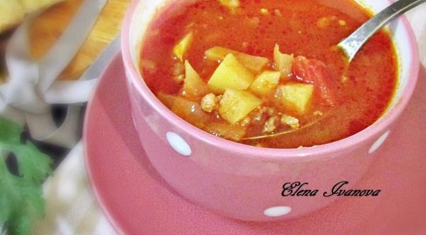 Описание: Густой томатный суп с фаршемИнгредиенты:Фарш — 450 гВода — 1200 млПомидоры в собственном соку — 400 гТоматная паста — 70 гЯблоко — 1 шт.Репчатый лук — 1 шт.Картофель — 4 шт.Соль — по вкусуСахар — 1 ст. л.Карри — 1 ч. л.Молотый имбирь — 1 ч. л.Чеснок — 3 зубчикаРастительное масло — 1 ст. л.Приготовление:1. Мясной фарш обжарить на сухой сковороде до готовности. Готовый фарш переложить на тарелку.2. Репчатый лук почистить и нарезать полукольцами. Чеснок почистить и нарезать пластинами. Кислое яблоко почистить и нарезать соломкой.3. В сковороду, в которой жарился фарш, влить растительное масло. Выложить лук, чеснок и яблоки. Добавить карри и имбирь. Тушить всё до мягкости.4. Картофель почистить и нарезать кубиком. Помидоры освободить от шкурки и крупно порезать.5. В кастрюле соединить воду, помидоры с соком, томатную пасту. Поставить на огонь, довести до кипения и кипятить несколько минут. Затем в кастрюлю положить картофель, довести до кипения и варить 7 минут. Добавить фарш и дать массе закипеть.6. В последнюю очередь добавить соль, сахар и жаренную яблочно-овощную смесь. Варить суп до готовности. Подавать суп горячим с черным солодовым хлебом.Приятного аппетита! ©Автор: Елена Иванова