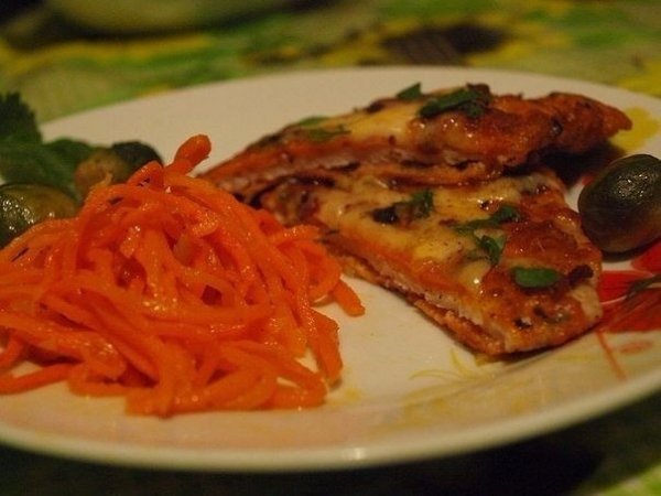 Описание: Ингредиенты:Свинина (мякоть) 800 гТоматная паста 2 ст. л.Сыр 100 гЯйцо 2 шт.Масло растительное 200 гМука (пшеничная) 3 ст. л.Зелень (рубленная петрушки и укропа) 2 ст. л.Специи (соль, перец красный и черный) по вкусуПриготовление:1. Мякоть нарежьте порционными кусками. Отбейте. Посолите и поперчите.2. Яйца смешайте с томатной пастой и солью. Добавьте часть зелени и часть натертого сыра, добавьте муку и перемешайте.3. Мясо запанируйте сначала в муке, затем в приготовленной смеси и обжарьте на масле до готовности (приблизительно по 1 минуте на каждой стороне).4. При подаче посыпайте оставшимся сыром и зеленью. На гарнир подайте картофельное пюре или отварные овощи.Приятного аппетита!