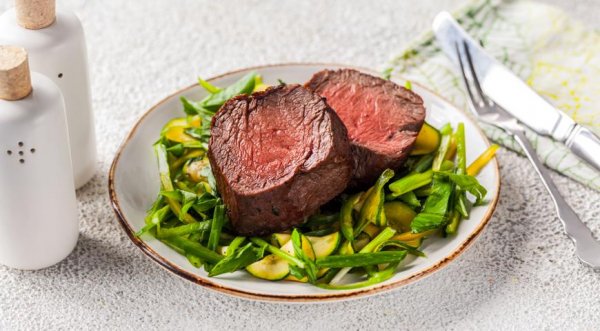 Описание: 1 говяжья вырезка весом 1 кг7–8 зубчиков чеснока7–8 веточек тимьянапо 1,5 ст. л. оливкового и топленого масласоль, свежемолотый черный перецДля зеленой «подушки»:1 средний цукини1 зеленый сладкий перец1 средний пучок зеленого лука5–7 веточек базиликаЗачистите вырезку, удалив все пленки, натрите мясо со всех сторон солью и перцем.Нагрейте смесь масел в большой сковороде, бросив туда раздавленные зубчики чеснока и веточки тимьяна.Обжарьте мясо со всех сторон до уверенной румяной корочки, поливая маслом, затем заверните в фольгу. Положите ростбиф на противень и установите его в центр разогретой до 250 °С духовки. Сразу же уменьшите температуру до 150 °С и запекайте ростбиф до желаемой степени прожарки, от 15 до 25 мин. Остудите в фольге, 40 мин.Аккуратно слейте жидкость из упаковки с ростбифом в сковороду. Очистите и нарежьте тонкой соломкой овощи для зеленой «подушки» – тоньше всего нужно нарезать перец. Зеленый лук нарежьте кусочками длиной 5–6 см, разрежьте их вдоль пополам.Выложите овощи в сок от мяса и на сильном огне быстро прогрейте, 3 мин. Добавьте листочки базилика (без стеблей). Снимите с огня, приправьте перцем.Выложите смесь из сковороды на тарелки. Нарежьте ростбиф поперек на куски толщиной 4 см и выложите на зеленую «подушку». Сразу же подавайте.