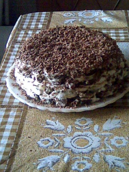 Описание: Отличный тортик БЕЗ ВЫПЕЧКИ!Ингредиенты.Пряники шоколадные-500гСметана-500гСахарная пудра-100гБанан-2-3шт.Грецкие орехи. Приготовление.Пряники разрезать вдоль пополам, бананы нарезать кружками, сметану смешать с сахарной пудрой, орехи покрошить не очень мелко. Миску выстелить пищевой пленкой, чтоб края свисали. Ломтики пряника окунать в сметану и укладывать на дно миски, пробелы заполнять обломками пряника.Следующим слоем выложить банан, на него опять слой пряников, далее опять слой бананов, посыпать орехами. На него опять выложить слой прямиков. Слоев может быть больше, в зависимости от размеров и формы и количества ингредиентов.Орехов можно класть больше на каждый слой или не класть совсем (по вкусу). При такой выкладке, пряники похожи на обычные коржи с банановой прослойкой. Влажность торта регулируется количеством сметаны. Если пряник густо покрыт сметаной, торт получится нежный по консистенции.Выдержать в холодильнике, не менее 3х часов (или на ночь), перевернуть на тарелку, снять пленку.Украсить сверху тертым шоколадом или какао. И приятного аппетита!