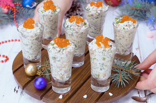 Описание: СЕЛЬДЬ В РЮМКЕИнгредиенты150 г сметаны10 г желатина2 шт. огурца1 пуч. укропа1 пуч. зеленого лука250 г селедкисоль по вкусуспеции по вкусуДля украшения вам понадобитсякрасная икра по вкусуПриготовлениеЗамочите желатин в холодной воде и оставьте его набухать.Нарежьте огурцы небольшими кубиками. Измельчите зелень и зеленый лук. Нарежьте сельдь и смешайте все ингредиенты.Полностью растворите набухший желатин. Можете добавить в смесь немного кипятка или использовать микроволновку. Добавьте желатин в сметану и тщательно перемешайте ее.Добавьте сметанную заливку, соль и специи в смесь из сельди и овощей, затем перемешайте.Оформите закуску порционно: выложите смесь в стеклянные рюмки, затем украсьте красной икрой.Поставьте закуску в холодильник на несколько часов, чтобы она застыла.