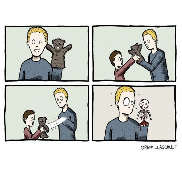 Описание: Французский художник Реми Ласко прославился в интернете тем, что создаёт абсурдные комиксы обо всём на свете. Иллюстрации из четырёх кадров всегда заканчиваются неожиданно и буквально пропитаны чёрным-чёрным юмором.