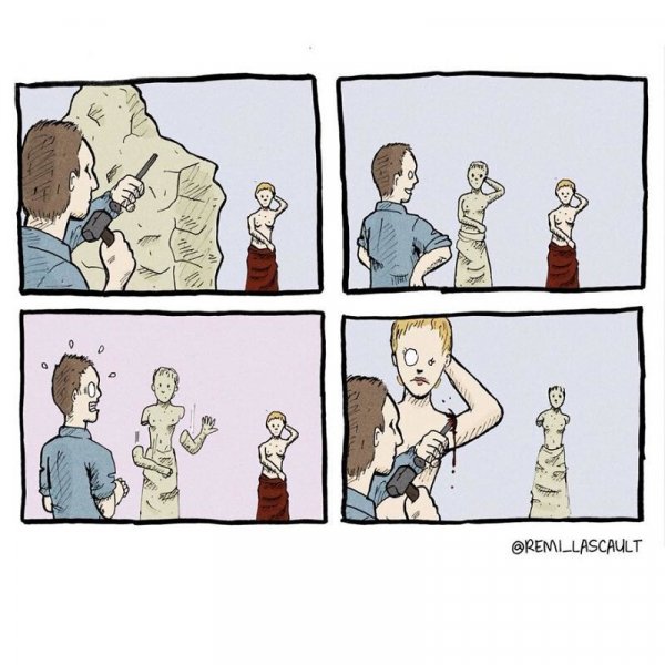 Описание: Французский художник Реми Ласко прославился в интернете тем, что создаёт абсурдные комиксы обо всём на свете. Иллюстрации из четырёх кадров всегда заканчиваются неожиданно и буквально пропитаны чёрным-чёрным юмором.