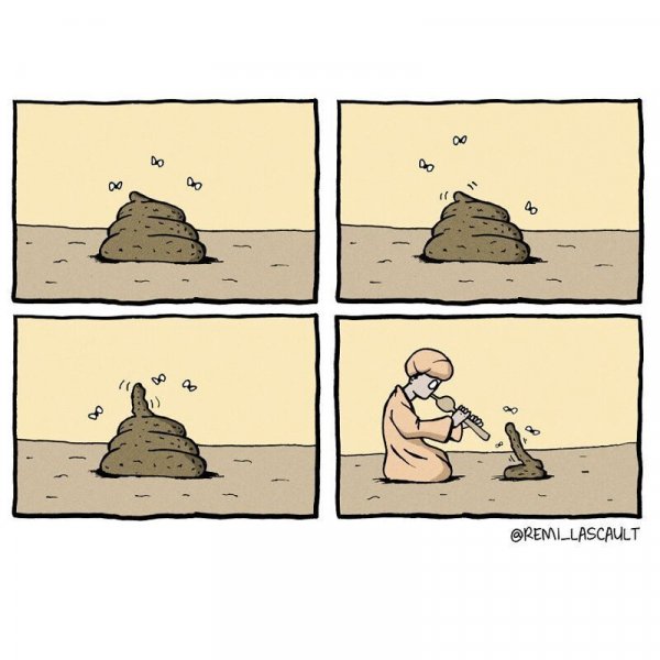 Описание: Французский художник Реми Ласко прославился в интернете тем, что создаёт абсурдные комиксы обо всём на свете. Иллюстрации из четырёх кадров всегда заканчиваются неожиданно и буквально пропитаны чёрным-чёрным юмором.