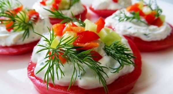 Описание: Помидоры с творогом и чесноком.Ингредиенты: 100 гр. творога, 2 столовые ложки сметаны, 50 гр. свежего огурца, 50 гр. свежего болгарского красного перца, 1 зубок чеснока, 1 крупный помидор, зелень укропа.Приготовление: Творог смешиваем с измельченным чесноком, добавляем сметану, зелень укропа, соль, перец. Хорошо перемешиваем. красный болгарский перец и огурец мелко нарезаем. Помидор нарезаем кружочками и на каждый выкладываем творожную начинку. Сверху посыпаем перцем и огурцом. Украшаем зеленью укропа. Вкусно, полезно, красиво!
