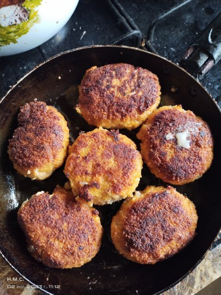 Описание: Примерно 1 кг свинины( грудинка или окорок)черный хлеб( я беру почти целый);2 крупные луковицы, сырое яйцо;соль, специи, можно добавить морковку или сырую картошину.мясо провернуть с луком через мясорубку, у хлеба срезать корку, а мякиш залить водой или теплым молоком,чтоб жидкость почти покрыла хлеб;.размять его,чтоб получилась кашица. затем смешать с фаршем, добавить сырое яйцо, специи,( у меня сухой чеснок, хмели, паприка,белый молотый перец) добавить соль по вкусу, все хорошо смешать. слепить котлеты и обвалять в сухарях( у меня сухари смешаны с куркумой и паприкой; они получаются почти оранжевые).иногда я прокручиваю мясо с морковкой или сырой картошиной.