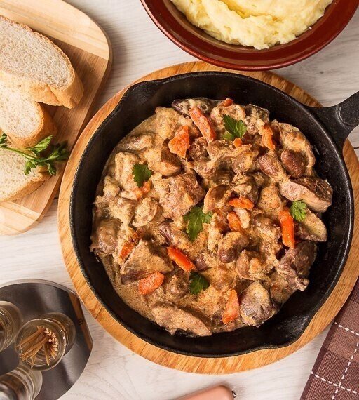 Описание: РАГУ ИЗ КУРИНЫХ ПОТРОШКОВ.Ингредиенты на 6 порций:400 г куриной печени400 г куриных желудков400 г куриных сердечек (все субпродукты - в уже обработанном состоянии, вес нетто)1 крупная морковь2 средние луковицысоль и перец по вкусу400 мл куриного бульона или воды2 зубчика чеснока150 мл сливок 20%Приготовление:Сердечки и желудочки обжариваем на сильном огне в несколько заходов до румяной корочки, по 1-2 минуте на заход. Перекладываем на тарелку.Уменьшаем огонь до среднего, кладем в сковороду нарезанную брусочками морковь и лук, нарезанный на четвертинки колец.Жарим, помешивая, 3-4 минуты. Возвращаем в сковороду желудки и сердечки, вливаем бульон или воду, солим по вкусу. Доводим до кипения и тушим под крышкой до мягкости желудков, около 40 минут.Печень обжариваем на сильном огне до румяной корочки.Добавляем в рагу за 7 минут до готовности. За 2 минуты до готовности добавляем чеснок и сливки.Подаем, посыпав зеленью.Приятного аппетита!