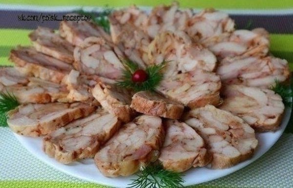 Описание: Куриный рулет, запеченный в фольге. Мясная закуска без желатина, которая с успехом заменит колбасу. Времени на её приготовление нужно всего немного.⠀ Ингредиенты: Куриные бедра – 1 кг. Соль – 1 ч.л. Черный перец — по вкусу. Сладкая паприка – 1 ч.л. Чабрец – 1/2 ч.л. Сухой чеснок – 1/2 ч.л. ⠀ Приготовление: Для этой закуски лучше всего подойдут куриные бедра, но можно использовать и голени с грудкой. Мясо необходимо отделить от костей. Я использую мясо вместе со шкурками, но шкурки можно снять и приготовить без них. Нарезаю мясо на произвольные кусочки. ⠀ Мясо солим, перчим по вкусу, добавим 1 ч.л. сладкой паприки, 1/2 ч.л. чабреца и 1/2 ч.л. сухого чеснока. Хорошо перемешаем, распределяя специи по мясу. Желатин в этом рецепте не понадобиться. Ветчина отлично держит форму благодаря своим натуральным желирующим свойствам. ⠀ Расстилаем фольгу, сверху выкладываем подготовленное мясо на один край. Заворачиваем рулетиком. Фольги не жалейте, нужно хорошо упаковать мясо, чтобы сок не вытекал. ⠀ Запекаем в духовке при температуре 180°С на среднем уровне без конвекции 80 минут. Вынимаем из духовки, сверху ставим пресс, у меня разделочная доска и 1 кг. крупы. Отправляем в холодильник на 6-8 часов, а лучше на ночь. Приятного аппетита!