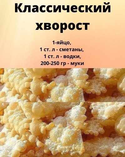 Описание: Замесить тесто, смазать оливковым маслом и дать постоять минут 15-30, накрыв полотенцем. Раскатать очень тонко, нарезать полоски или ромбики, жарить в хорошо разогретом масле. Готовый хворост посыпать сахарной пудрой. Приятного поедания вкусняшек!!!
