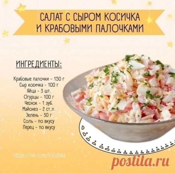 САЛАТ С СЫРОМ КОСИЧКА И КРАБОВЫМИ ПАЛОЧКАМИ