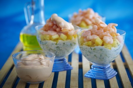 Описание: Салат вымыть, разобрать на листья, обсушить и очень тонко нарезать. Сельдерей нарезать тонкой соломкой. Чеснок очистить и измельчить. Кружки ананаса нарезать небольшими кубиками.Смешать сельдерей, чеснок и салатные листья. Приправить солью, кайенским перцем и половиной майонеза.Приготовить «розовую» заправку. Аккуратно перемешать оставшийся майонез с 0,5 ч. л. кетчупа.В высокие бокалы выкладывать слоями салатную смесь, ананасы и креветки. Сверху украсить приготовленной заправкой.180 г креветок в рассоле «Меридиан»1 кочан салата латук1 черешок сельдерея2 кружка ананаса1 зубчик чеснокащепотка кайенского перца1,5 ст. л. майонеза0,5 ч. л. кетчупасоль