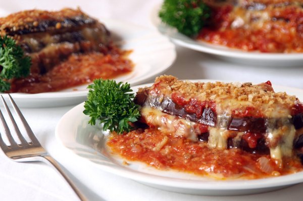 Описание: 750 г баклажанов,3 яйца,30 г муки,30 г сливочного масла,соль, перец,томатный соус,оливковое масло для жарки,пармезан тертый,50 г сыра МоцареллаБаклажаны нарезать кружками толщиной 1 см, посолить с двух сторон и дать постоять. Затем промокнуть и обвалять в муке с перцем и взбитыми яйцами. Кусочки обжарить в масле с обеих сторон до золотистого цвета и выложить на специальную бумагу, чтобы жир впитался. В томатный соус добавить специи по вкусу и вылить половину в форму для запекания, после чего выложить туда баклажаны слоями, каждый слой посыпая тертым пармезаном и моцареллой. После этого сверху вылить оставшийся соус, посыпать тертым пармезаном, закрыть фольгой и запекать в предварительно нагретой духовке 25-30 мин при температуре 200 С. На последние 10 мин запекания фольгу следует убрать. Готовое блюдо выложить на тарелку и подавать на стол.
