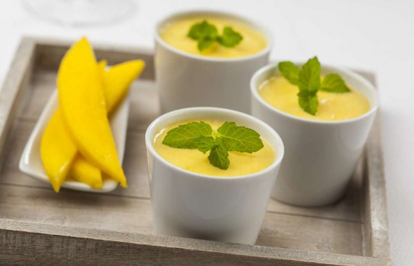 Описание: Манго-4 шт.из трех делаем пюре,чтобы получилось 450 гродин для украшения1 банка сгущенки-250 мл1 пакет желе персика или манго150 мл воды200 мл сливок3 листика желатинаВскипятить воду в кастрюльке.Всыпать желе и хорошо размешать.В блендере взбить манго,превратив его в пюре.Сливки взбить до увеличения в объеме.Затем влить сгущенку,не переставая взбивать.После положить манговое пюре.Последними влить остывшее желе и желатин,предварительно замоченный в холодной воде,а затем разведенный в 2 ст.л горячего молока.Форму смочить холодной водой,влить готовую смесь и поставить в холодильник на 5-6 часов.По прошествии времени достать,ножом аккуратно провести по краям(можно дно формы опустить в теплую воду) и перевернуть форму на тарелку.Украсить кусочками манго.