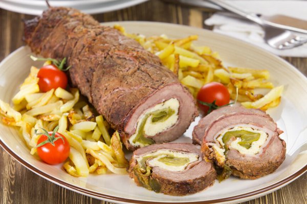 Описание: Мякоть телятины 0,6 кгшпик 60 ггрудинка (или окорок) копчёные б-к 140 гогурец солёный 80 гяйцо кур.1 шт.масло сливочное 40 гмука пшеничн. 5 гсоль/перец ч.м., специиМясо нарезать широкими ломтиками толщиной 3 см и размером 10х10 см, отбить и натереть специями.Шпик и копчёности нарезать ломтиками, уложить на мясо.Из яйца сделать блинчик, разрезать на полоски, положить на мясо.Огурец очистить от кожицы и семян, измельчить, посыпать на мясо с остальными ингредиентами.Свернуть всё рулетом, перевязать ниткой, обжарить с обеих сторон на жире.Затем рулет уложить в глубокую посуду, добавить бульон,довести до готовности в духовке.Из мясного сока и жира сделать соус, добавив муку.Подавать рулет горячим, с отварным или жареным картофелем, тушеными овощами, салатом.