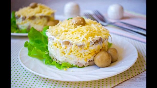Описание: Мясо куриное 50 гконсерв. грибы или свежие 50 глук - репка 10 гсыр "эмменталь" 10 гкартофель 20 гмайонез оливк. 50 гзелень свежая (укроп, петрушка, кинза)Отварное мясо кур охладить, нарезать ломтиками.Грибы обжарить, охладить, нарезать ломтиками.Лук ошпарить, нарезать мелким кубиком.Отварной очищенный картофель охладить, нарезать кубиками.Сыр натереть на крупной тёрке.Все ингредиенты соединить с майонезом, выложить в салатник, засыпать сыром и оформить зеленью.