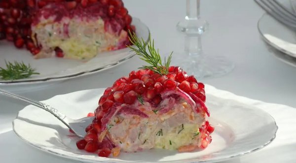 Описание: Копченая курица — 250 гсвекла — 1 шт. (250 г)морковь — 1 шт. (140 г)картофель — 3 шт. (300 г)репчатый лук — 1 шт. (100 г)чеснок — 3 зубчика (15 г)яйца — 3 шт.грецкие орехи — 70 гмайонез — 250 гзелень укропа — 1 пучокгранат — 1 шт. (400 г)растительное масло — 2 ст. л.соль — 1 ч. л.черный свежемолотый перец — 1 ч. л.Подготовьте все необходимые ингредиенты. Картофель, яйца, морковь, свеклу тщательно вымойте и отварите до готовности. Остудите, очистите и натрите на крупной терке или нарежьте мелким кубиком.Грецкие орехи порубите ножом и прокалите на сухой сковороде в течение 5 минут. Снимите с огня, пересыпьте на тарелку и остудите.Разогрейте сковороду, влейте 2 ст. л. растительного масла и обжарьте нарезанный соломкой репчатый лук в течение 3–5 минут. Снимите с огня, остудите и смешайте с грецкими орехами.Копченую курицу нарежьте мелким кубиком. В миске смешайте майонез, мелко рубленную зелень укропа и пропущенный через пресс чеснок.Установите стакан в центре сервировочного блюда и приступайте к сборке салата. Смешайте тертый картофель с 1 ст. л. майонезного соуса и щепоткой соли. Выложите равномерным слоем на блюдо вокруг стакана.Копченую курицу смешайте с 1 ст. л. майонезного соуса. Уложите на картофель следующим слоем, разровняйте поверхность.Третий слой салата — морковь, немного посолите ее и смешайте с майонезным соусом.Теперь слой яиц — слегка посолите и смешайте с 1 ст. л. майонезного соуса.К обжаренному луку и грецким орехам добавьте молотый черный перец и 1 ст. л. соуса. Перемешайте и выложите равномерно по кругу.Завершающим слоем выложите свеклу, предварительно посолив ее по вкусу и смешав с майонезным соусом. Салат поставьте в холодильник на 30 минут, чтобы все слои хорошо пропитались.Пока салат настаивается в холодильнике, очистите гранат. Посыпьте зернами салат.Полезный советСалат «Гранатовый браслет» с копченой курицей станет еще вкуснее, если добавить одним из слоев плавленый сыр. Купите сыр не в ванночке, а брусочком и натрите на терке. Он придаст салату сливочный вкус и дополнительную нежность.