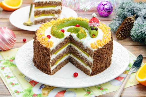 Описание: Яйца 4 шт.Сахар 100 гВанильный сахар 7 гСоль (щепотка)по вкусуМолоко 65 гРастительное масло 45 гРазрыхлитель 6 гКакао 15 гПшеничная мука 125 гДля крема:Творожный сыр380 гСливки жирные (33%)125 гСахарная пудра 90 гДля апельсинового конфи:Апельсины (средние (примерно 500 гр.))2 шт.Желатин 8 гВода (холодная кипяченая)50 млСахар 35 гДля пропитки:Апельсиновый сок 60 млСахар 30 гДля фигурки змейки:Готовое песочное печенье 75 гСгущенное молоко 45 гСливочное масло 20 гВанильный сахар (у меня с натуральным зеленым красителем) 0.25 ч.л.