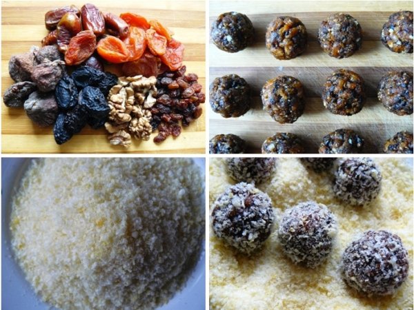 Описание: 150 г кураги150 г чернослива без косточек1 стакан фундука1 стакан кокосовой стружки100 г шоколада (черного и белого)1 большой апельсинВыжмите сок из апельсина.Подогрейте сок в ковше. Курагу залейте в миске горячим соком на 30 мин. Откиньте на дуршлаг, хорошо отожмите.Проверните курагу через мясорубку 2 раза. Добавьте к пюре из кураги 50 г кокосовой стружки, у вас должна получиться густая масса.Натрите цедру апельсина на мелкой терке, чернослив проверните через мясорубку 2 раза. Смешайте чернослив с цедрой.Обжарьте фундук на сухой сковороде и измельчите.Мокрыми руками сформируйте конфеты на доске, скатав их в шарики величиной с грецкий орех. Конфеты из кураги обваляйте в кокосовой стружке, а конфеты из чернослива – в фундуке. Растопите шоколад на водяной бане. Наколите конфету из чернослива на шпажку и обмакните в шоколад. Положите на решетку и дайте обсохнуть.Оставшийся сок можно немного проварить с медом и подать к овсяной каше на завтрак.Предлагаем вам провести время с пользой – приготовить домашние фруктовые конфеты. В них будут содержаться только те продукты, которые положите вы, и никаких красителей, консервантов, улучшителей и заменителей. И позовите с собой на кухню детей – пусть они помогают.