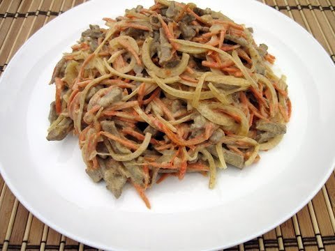 Описание: 500 г печени говяжьей300 г моркови по-корейски2 луковицырастительное масло, соль, майонезЛк нарезать соломкой.Подготовленную печень нарезать соломкой.Обжарить лук, добавить печень, обжаривать 5-7 минут до готовности.Остудить.Смешать все ингредиенты и заправить майонезом.