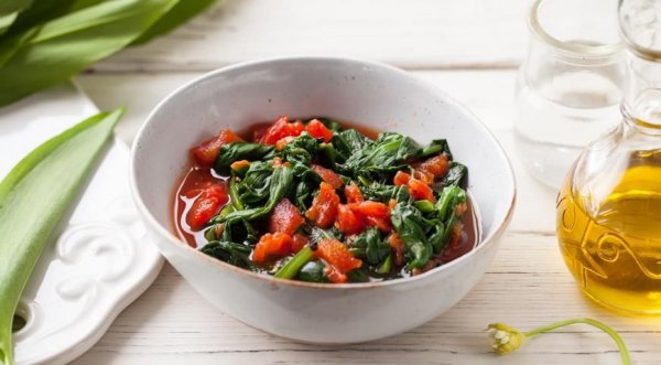 Описание: 2 пучка побегов черемши2–3 средних консервированных помидора в собственном сокубелый винный уксуснерафинированное подсолнечное или кукурузное маслосольОчистите и тщательно промойте побеги черемши. Положите в слабо кипящую чуть подсоленную воду и отварите до мягкости, затем откиньте на дуршлаг и дайте стечь всей жидкости.Мякоть консервированных помидоров без кожи раздавите вилкой и добавьте к отварной черемше. Заправьте салат солью, уксусом и маслом.Рецепт предоставлен Касымом Эристовым.