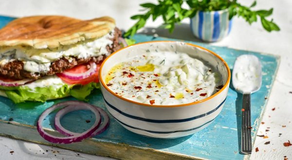 Описание: 15 минутДополнительное время: 35 минутДля приготовления 4 порций нужно:йогурт греческий — 400 гогурец — 200 глимон — 1 шт.мята свежая — 5 веточекчеснок — 3 зубчикамасло оливковое — 1 ст. л.укроп — 15 гсоль мелкая морскаяперец красный молотыйОгурцы очистите от кожицы и разрежьте пополам. Если семена очень крупные, удалите сердцевину с помощью чайной ложки. Натрите огурцы на крупной терке, посолите, перемешайте и оставьте на 5 минут.Отожмите натертые огурцы, слейте выделившуюся жидкость. Чеснок пропустите через пресс. Зелень мяты и укропа мелко порубите. Добавьте чеснок и зелень вместе с огурцами в чашу с йогуртом.Посолите соус, добавьте по вкусу свежевыжатый лимонный сок. Хорошо перемешайте, поставьте в холодильник на 30 минут. Перед подачей полейте дзадзыки оливковым маслом и посыпьте красным молотым перцем.