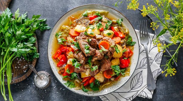 Описание: Говядина тонкий край 500 гКапуста белокочанная 350 гКартофель 300 гПерец сладкий красный 300 гБаклажан 200 гТомат (помидор) 200 гЛук репчатый 150 гМорковь 120 гЧеснок 4 зубчик(а)Масло растительное рафинированное 2 ст.л.Приправа для мяса 2 ч.л.Пряные травы по вкусуПерец чёрный молотый по вкусуСоль по вкусуПодготовьте все ингредиенты дымлямы. Картофель и морковь очистите. Картофель нарежьте крупными или средними кусочками, морковь — не слишком тонкими кружочками. Репчатый лук нарежьте толстыми полукольцами, зубчики чеснока —пластинами. Помидоры нарежьте не слишком крупными дольками, баклажан — кружочками толщиной не менее 7 мм. Сладкий перец разрежьте на половинки. Удалите семена и перегородки. Мякоть сладкого перца нарежьте крупными ломтиками или полосками, как вам будет удобно.Говядину нарежьте небольшими кубиками. У белокочанной капусты отделите крупные листья, срежьте места примыкания к кочерыжке. Листья понадобятся, чтобы накрыть овощи перед тепловой обработкой.Для приготовления дымлямы подготовьте казан или просто большую кастрюлю с толстым дном и стенками. На дно налейте растительное масло. Уложите слой нарезанной говядины. Посолите и поперчите.Сверху распределите лук. Слегка прижмите его руками к говядине. Посыпьте слегка размолотыми специями. Далее уложите слоями морковь, картофель, чеснок и баклажаны. Посыпьте сушеными пряными травами. Сверху так же слоями положите помидоры и, наконец, сладкий перец. Слегка посолите и поперчите. Прижмите все ингредиенты руками, уплотняя слои дымлямы. Накройте содержимое казана или кастрюли листьями белокочанной капусты. Они предохранят верхний слой овощей от пересыхания. Еще раз осторожно прижмите руками.Закройте казан или кастрюлю крышкой. Поставьте на слабый огонь. Готовьте дымляму в течение двух часов. Периодически открывайте крышку и проверяйте содержимое: если овощам не будет хватать сока, влейте немного воды.Выложите дымляму на большую тарелку в обратном порядке: сначала капустные листья, затем все овощи, и, наконец, мясо. Перед подачей можно посыпать рубленой петрушкой.Состав овощей для дымлямы вы можете менять в зависимости от собственных вкусовых предпочтений. Да и с мясом тоже можно поэкспериментировать: например, взять вместо говядины филе бедра индейки или баранину.ХОЗЯЙКЕ НА ЗАМЕТКУЧеснока в дымляму можно положить и побольше, до 8-10 зубчиков. И этот тот самый случай, когда переборщить практически невозможно: жгучести и особой остроты он не добавит, только лишь усилит аромат.