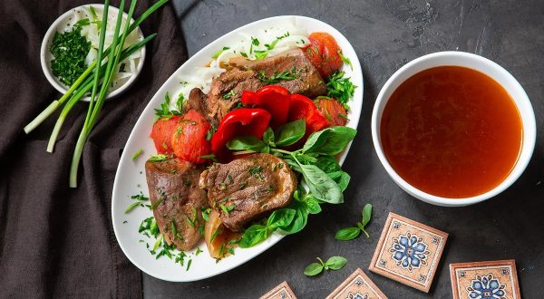 Описание: 1.5 кг говяжьего языка3 шт репчатого лука1 болгарский перец2 небольших помидора4 средних зубчика чеснока2 ч.л. соли2-3 лавровых листа1.5 ч.л паприкичерный перец горошкомнесколько веточек кинзызеленый лук, фиолетовый базилик и петрушка для подачиОпускаем говяжий язык в кипящую воду на 15 минут либо укладываем в кастрюлю и заливаем крутым кипятком, закрываем крышкой и оставляем на 5-10 минут. Достаем язык, очищаем от лишнего жира и снимаем кожу, промываем под проточной водой, разрезаем на 3-4 крупных куска и складываем в миску.Одну репчатую луковицу режем на крупные дольки. Также поступаем с болгарским перцем.Чеснок очищаем и давим ножом, добавляем к мясу и овощам, солим, посыпаем паприкой, добавляем черный перец горошком, рваную кинзу, все хорошо перемешиваем.Берем банку или пару банок помельче, если нет трехлитровой. Сначала складываем овощи, затем куски языка, сверху ошпаренные кипятком помидоры, добавляем лавровый лист. Закручиваем банку крышкой, ставим в высокую кастрюлю с толстыми стенками. Кастрюлю с банкой заливаем на 2/3 водой, закрываем сверху крышкой и ставим на плиту, даем закипеть воде. После закипания воды в кастрюле убавляем огонь. Далее варим около 4 часов на маленьком огне.После приготовления сливаем мясной сок, мясо с овощами выкладываем на блюдо.Режем репчатый лук тонкими перьями , мелко – зеленый лук и петрушку. Посыпаем мясо частью зеленью и листьями фиолетового базилика.КСТАТИМясной сок, оставшийся после варки языка в банке, можно также подать отдельно. Если он получился слишком концентрированным, нужно его разбавить кипяченой водой.