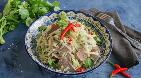 Описание: Мякоть говядины – 350 гзеленая редька – 300 гмаленький стручок острого красного перца – 1 шт.репчатый лук мелкий – 2-3 шт.растительное масло – 1 ст. л.майонез – 3-4 ст. л.кинза – 2 веточкисоль – по вкусуПодготовьте ингредиенты для приготовления салата Узбекистан. Говядину положите в кастрюлю, залейте кипящей водой и на сильном огне доведите до кипения. Снимите пену, немного посолите и варите на слабом огне 1,5 часа. Дайте остыть в бульоне.Луковицы очистите и нарежьте не очень тонкими кольцами. В небольшой сковороде нагрейте растительное масло. Положите кольца лука и, помешивая, подрумяньте. Дайте остыть.Редьку для салата очистите, крупно нарежьте и залейте холодной водой. Оставьте на 20-30 минут, затем натрите в миску на крупной терке. Острый перец, удалив семена, нарежьте тонкими колечками.Остывшую говядину для салата выньте из бульона и нарежьте острым ножом поперек волокон тонкими полосками. Посолите и поперчите по вкусу. Перемешайте.Подготовленные ингредиенты — говядину, редьку, жареный лук и острый перец —соедините в большой миске. Посолите по вкусу, добавьте майонез и перемешайте.Кинзу вымойте, обсушите и оборвите с веточек листочки. Салат Узбекистан классический разложите по порционным салатникам, украсьте листочками кинзы и подайте на стол.ПОЛЕЗНЫЙ СОВЕТСоус для заправки классического салата Узбекистан можно сделать более интересным, соединив, например, натуральный йогурт с небольшим количеством горчицы и лимонного сока или яблочного уксуса.КСТАТИГовядину для классического салата Узбекистан лучше отварить заранее, причем сделать это специально, в небольшом количестве воды, а не просто взять из бульона для супа. Чтобы мясо получилось более ароматным и вкусным, добавьте при варке в кастрюлю луковицу, морковку и кусочек корня сельдерея или петрушки.