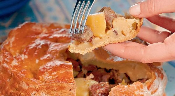 Описание: 3–3,5 стакана муки500 г сметаны или простоквашисольсахарДля начинки:1,5–2 кг мясного филе (говядина, баранина, свинина, курица, гусь, утка)2 кг картофеля3 луковицы3 ст. л. сливочного масла1 стакан мясного бульонасольсвежемолотый черный перецСмешайте все ингредиенты для теста в глубокой миске и вымесите эластичное тесто так, чтобы оно не липло к рукам и скалке. Отставьте на 20 мин. 2. Лук очистите и нарежьте мелкими кубиками. Мясо нарежьте крупными кубиками и смешайте с картофелем, очищенным и нарезанным так же. Добавьте лук, посолите, поперчите и перемешайте.Отделите одну четвертую часть теста. Оставшийся большой кусок раскатайте слоем толщиной 6–7 мм. Размер раскатанного теста должен быть таким, чтобы его края свисали с большой круглой формы (керамической или чугунной).Подготовленную начинку выложите на раскатанное тесто и края его соберите к центру.От меньшей части теста оторвите кусочек размером с шарик для пинг-понга. Затем раскатайте оставшееся тесто в лепешку, закройте ею бэлиш, соедините края и защипните их. Посередине сделайте отверстие, влейте растопленное масло и закройте его, как бутылку пробкой, получившимся шариком. Верх бэлиша смажьте яйцом и поставьте в духовку на 1–1,5 ч.Затем выньте, уберите шарик, влейте 3/4 бульона, верните шарик на место, накройте пирог фольгой и снова поставьте в духовку на 1 ч. Перед подачей бэлиша на стол (прямо в форме) долейте в него еще немного бульона.КСТАТИСамое главное в бэлише с курицей и картофелем — это подача. Подрежьте верхнюю корочку. При помощи ложки переложите на тарелки начинку. Пирог традиционно едят вилкой, помогая кусочком верхней корочки. ХОЗЯЙКЕ НА ЗАМЕТКУНижнюю корочку зур бэлиша с курицей и картофелем, пропитанную бульоном и жиром, можно разделить на всех гостей — после того, как они съедят всю начинку.