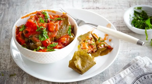 Описание: 250 г длиннозёрного риса2-3 консервированных очищенных помидора в с/с1 большая луковица или 4 ст.л. нарезанного зелёного лука2 ст.л. мелко нарезанной петрушки2 ч.л. сушеной мяты¼ ч.л. молотой корицы¼ ч.л. молотого душистого перца250 г консервированных виноградных листьев2 помидора3-4 зубчика чеснока150 мл оливкового масла150 мл воды1 ч.л. сахарасок одного лимонасоль, черный перец свежего помолаРис промойте и замочите в кипятке, затем промойте под струей холодной воды. Откиньте на дуршлаг.Обсушенный рис смешайте с помидорами, луком, петрушкой, мятой, солью и специями.Заверните долму, выкладывая начинку на матовую сторону листа.На дно казана положите нарезанные ломтиками помидоры, бракованные виноградные листья и плотно уложите долму. Между долмой можно положить зубчики чеснока.Смешайте оливковое масло с водой, посолите, добавьте сахар и лимонный сок и залейте этой смесью виноградные листья. Закройте перевёрнутой тарелкой, закройте казан и готовьте на очень тихом огне 2 часа, подливая воду небольшими порциями по мере необходимости. Остудите в казане и подавайте в холодном виде.ПОЛЕЗНЫЙ СОВЕТХолодную долму очень украсит соус из йогурта, смешанного с пряными травами, чесноком и специями. КСТАТИНе пытайтесь сократить время приготовления долмы: в процессе долгого бережного тушения все ароматы блюда соединяются, а нежный рис пропитывается вкусом соуса и виноградных листьев.