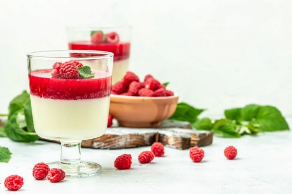 Описание: Для панна-котты:Сливки (33%) – 500 млСахар – 100 гВанильный сахар – 15 гЖелатин – 10 гДля малинового желе:Малина – 300 гСахар – 70 гЖелатин – 10 гВода – 200 млЗамочите желатин. Возьмите столько воды сколько указано на упаковке и замочите в ней желатин. Отставьте в сторону чтобы он набух.Сливки поставьте на огонь. Добавьте ванильный сахар и сахар, хорошо перемешайте. Доведите до кипения, но не кипятите, сразу снимайте с огня.Смешайте сливки с желатином, перемешайте и разлейте по стаканам. Отправьте первый слой в холодильник для застывания и готовьте второй.Малину перебейте в блендере. Смешайте ее с водой и сахаром и поставьте на огонь.Пока малина готовится, приготовьте вторую порцию желатина. Сделайте то же самое что и в первый раз.Когда малина закипит, снимите ее с огня, дайте немного остыть и добавьте желатин. Долейте второй слой к панна-котте и поставьте в холодильник застывать.При подаче украсьте десерт свежими ягодами.
