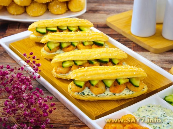 Описание: Тесто:250 мл воды100 г сливочного масла4 яйца180 г муки½ ч.л. соли100 г сыра (типа российского, гауды и т.д.)кунжутначинка:200 г отварных креветок (очищенных)200 г творожного сыра1 ч.л. сушеного молотого чеснока (или 1–2 зубчика нарезанного)½ ч.л. молотой сладкой паприкиогурецзелень по вкусурастительное маслолимонГотовим эклерыСыр натереть на мелкой терке.Воду довести до кипения.Добавить масло.Добавить соль.Довести до кипения.В кипящую воду всыпать муку.Перемешать.Проварить в течение 2 минут.Массу немного остудить.Добавить одно яйцо.Перемешать.Добавить второе.Перемешать.Добавить третье.Перемешать.Добавить, таким образом, все яйца (если яйца мелкие, их может понадобиться 5 штук).Добавить сыр.Перемешать.Противень застелить бумагой для выпечки или смазать маслом.При помощи кондитерского шприца выложить эклеры длиной около 9 см.Если шприца нет, можно положить тесто в пакетик, отрезать уголок, и выдавить тесто.Посыпать кунжутом.Поставить в разогретую до 180 градусов духовку.Выпекать в течение 35–40 минут.Во время выпечки дверцу духовки не открывать.Готовим начинкуСковороду смазать маслом.Разогреть.Выложить креветки.Немного сбрызнуть соком лимона.Добавить чеснок и паприку.Перемешать.Обжарить в течение 1–2 минут.Остудить.Зелень мелко нарезать.Смешать творожный сыр и зелень.Огурец тонко нарезать.Эклеры разрезать (не доходя до конца).На нижнюю половину выложить сыр.Выложить креветки.Выложить огурцы.Накрыть верхней половиной.Приятного аппетита!