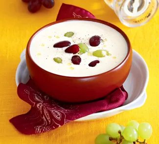 Описание: 150 г черствого белого хлеба150 г нежареного миндаля3 зубчика чеснока100 мл оливкового масла «экстра вирджин»30 мл сухого хереса или сухого белого вина700 мл питьевой водысок половины лимона200 г крупного белого и темного виноградасоль, свежемолотый черный перецЗаранее сильно охладите питьевую воду, пусть она будет ледяной. Нарежьте хлеб крупными ломтями, залейте 200 мл холодной питьевой воды и оставьте на 10 мин.Миндаль залейте кипящей водой так, чтобы он был покрыт на 2 см, оставьте на 5 мин., после чего слейте горячую воду, залейте миндаль холодной и очистите от кожицы, сдавливая ядрышки между большим и указательным пальцем так, чтобы они выскакивали из нее.Чеснок раздавите и очистите. Положите очищенный миндаль и чеснок в кухонный комбайн или блендер и измельчите. Добавьте хлеб вместе с водой, в которой он замачивался, и взбейте все вместе.При работающем моторе тонкой струйкой влейте оливковое масло, потом херес и оставшуюся холодную воду. Приправьте солью и перцем и поставьте в холодильник минимум на 2 ч.За час до подачи снимите виноград с веточек, разрежьте каждую виноградину пополам и при помощи зубочистки или острым кончиком тонкого ножа удалите все косточки. Сбрызните виноград со стороны разреза лимонным соком и поставьте в холодильник. Одновременно поставьте в холодильник тарелки, в которых вы собираетесь подавать суп.Разлейте холодный суп по тарелкам, посыпьте свежемолотым перцем, выложите в тарелки виноград, сбрызните оливковым маслом и подавайте.