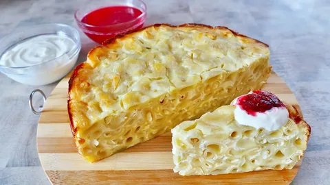 Описание: Мелкие макароны - 250г. творог - 300-400гваренье (вишневое, можно яблочное) - 1 стаканяйцо - 1 шт.молоко - 1 стаканвода - 1 стакансливочное масло - 100гванилин - 1 пачкасахар - 2 ст.л.соль - 1/2 ч.л.Творог хорошенько растереть с половиной варенья.Макароны сварить на молоке с водой, добавив соль, сахар и ванилин. Вареные макароны откинуть на дуршлаг.В чуть охлажденные макароны положить половину сливочного масла и хорошо перемешать. Добавить яйцо и перемешать еще раз.В жаропрочную форму выложить сначала половину макарон.Поверх макарон распределить творожную массу с вареньем.И снова - слой макарон. На макароны выложить кусочки оставшегося сливочного масла и поставить выпекаться в прогретую до 220С духовку до образования золотистой корочки. Готовую макаронную запеканку можно подавать горячей или холодной, украсив её оставшимся вишневым или яблочным вареньем.