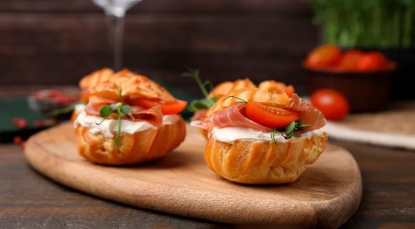 Описание: 10 минутДля приготовления 1 порции нужно:готовые профитроли — 2 шт.крем-чиз — 2 ст. л.хамон — 2 ломтикапомидор черри — 1 шт.микрозелень для подачиПрофитроль разрежьте горизонтально пополам, снимите «крышечку». Удобнее всего это сделать кухонными ножницами.В профитроль положите 1 ст. л. крем-чиза.Ломтики хамона сложите пополам, а затем еще раз пополам. Положите на крем-чиз и слегка прижмите. Украсьте профитроль половинками помидора черри, микрозеленью, накройте «крышечкой». Сразу же подавайте на стол.
