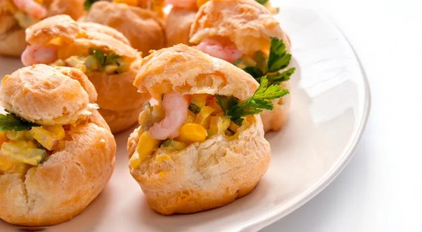 Описание: 15 минутДополнительное время: 5–10 минутДля приготовления 4 порций нужно:профитроли готовые — 8 шт.яйца отварные — 2 шт.небольшой огурец — 1 шт.коктейльные креветки — 8 шт.кукуруза сладкая консервированная — 3 ст. л.лук красный — 1/4 шт.жирная сметана — 1 ст. л.сольсвежемолотый белый перецпетрушка для подачиСвежий огурец мелко нарежьте, переложите в миску, посолите, оставьте на 5–10 минут. Затем слейте всю образовавшуюся жидкость — так салат не станет слишком водянистым.Красный лук и яичный белок нарежьте мелкими кубиками, добавьте в миску к огурцам. Желтки разомните вилкой, смешайте со сметаной, поперчите по вкусу.Добавьте в миску сладкую кукурузу и заправку из сметаны и желтков. Тщательно перемешайте.Профитроли надрежьте сбоку и нафаршируйте получившейся начинкой. Сверху положите по креветке и листочку свежей петрушки. Подавайте на стол.