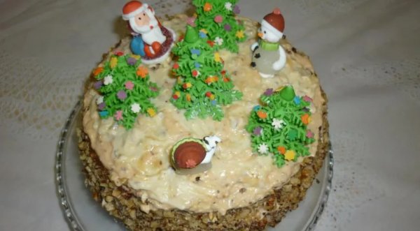 Описание: Яйцо 2 шт.сметана 1 стакан(а)сахар 1 стакан(а)мука 1 стакан(а)сода погашенная уксусом 0,5 ч.л.молоко ( крем) 1,5 стакан(а)сахар (крем) 1 стакан(а)масло (крем ) 300 гмука (крем ) 2 ст.л.Орехи обжарить и порезать ножом. Приготовить тесто. Яйца взбить с сахаром, добавить сметану, соду, погашенную уксусом, муку и половину орехов. Испечь корж, разрезать его на две части и остудить.Приготовить крем. 2 ст.л. муки смешать с 0,5 стакана холодного молока. 1 стакан молока закипятить, добавить разбавленную муку и заварить крем, охладить, добавить масла и сахар, взбить все в пену. Промазать торт кремом обсыпать оставшимися орехами.Так я делаю елки из мастики. Мастику раскатать , припудрить крахмалом, вырубкой "снежинки" наделать заготовки. В середине каждой снежинки зубочисткой проткнуть дырочку и оставить чтоб они подсохли и держали форму.Потом скатать горошинку из мастики, надеть ее на зубочистку, затем надеть снежинку.Так чередуя горошинки и снежинки разных диаметров создать елочку, сверху налепить конус из мастики.Из разных сахарных посыпок сделать декор на елке.