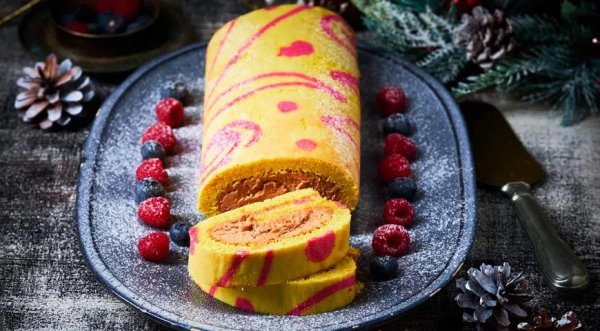 Описание: 6 крупных яиц С0180 г мелкого сахара120 г пшеничной муки60 г миндальной муки60 г сливочного масла 82,5%1 ч. л. куркумы, ванильДля крема:200 г сгущенного молока6 желтков крупных яиц С0100 г сливочного масла 82,5%100 г молочного шоколадасок и цедра 1 апельсина1 ч. л. флёрдоранжа, воды цветов апельсинаДля украшения:30 г сахарной пудры30 г сливочного масла 82,5%по 30 г муки и яичного белкакрасный пищевой красительмасло для противняДля крема в кастрюльке с толстым дном смешайте сгущенное молоко с желтками и апельсиновым соком, варите на слабом огне, перемешивая, до загустения, 5 мин.Добавьте цедру и флёрдоранж, перемешайте, переложите в миску. Накройте крем пленкой «в контакт» и остудите.Взбейте сливочное масло до пышности, в три приема добавьте желтково-молочную массу. Шоколад разломайте и растопите в микроволновке или на водяной бане, вмешайте в крем.Для украшения разотрите мягкое сливочное масло с сахарной пудрой добела. Смешайте с белком, а затем с мукой. Добавьте краситель. Выложите тесто в кондитерский мешок или бумажный фунтик, отрежьте кончик – чтобы получилось отверстие диаметром 1 см.Застелите противень 30х40 см силиконовым листом. Если используете пергамент, щедро смажьте его маслом, припылите мукой. Выложите из подкрашенного теста узоры на силикон. Поставьте в морозильник.Для основы растопите и полностью остудите масло. Соедините в чаше планетарного миксера или в глубокой миске яйца с сахаром и ванилью, взбивайте до состояния пышной светлой пены, 10 мин.Всыпьте куркуму, пшеничную и миндальную муку, перемешайте. Отложите несколько ложек теста, смешайте с маслом. Добавьте эту смесь к основной массе бисквитного теста и аккуратно перемешайте до однородности.Вылейте тесто поверх узора в противень, разровняйте, постучите об стол. Выпекайте при 180 °С примерно 15 мин. Затем переверните бисквит на застеленную пергаментом рабочую поверхность, снимите силикон или пергамент и снова переверните.Промажьте всю поверхность бисквита кремом и, помогая себе пергаментом и линейкой, сверните плотный рулет. Заверните рулет в пергамент и потом в пленку, закрутите концы, положите рулет швом вниз в холодильник минимум на 4 ч.