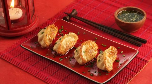 Описание: Для соуса:4 ст. л. рисового уксуса2 ст. л. соевого соуса1/2 ч. л. темного кунжутного масла1 ч. л. семян кунжута2 пера зеленого лукаДля теста:200 г муки100 мл кипящей воды1 ст. л. растительного масла1 щепотка солиДля начинки:700 г креветок2 см корня имбиря3 листа пекинской капусты3 пера зеленого лука1 ст. л. саке1 ст. л. мирина1,5 ч. л. кунжутного масласольПросейте муку с солью в большую миску. Добавьте кипящую воду и перемешайте палочками, чтобы получилась крошка.Влейте растительное масло и продолжайте смешивать, пока масло полностью не впитается в тесто. Затем соберите тесто руками в шар, заверните в пленку и оставьте на 30 мин.Промесите тесто в течение нескольких минут на слегка подпыленной мукой столешнице. Когда тесто станет гладким, снова заверните его в пленку и оставьте на 30 мин.Разделите тесто на две части. Каждую раскатайте до толщины 2 мм. Вырежьте из теста круги диаметром 11 см.Очистите креветки и мелко нарежьте. Натрите имбирь на мелкой терке. Тонко нарежьте пекинскую капусту и зеленый лук.Положите в миску все ингредиенты для начинки и хорошо перемешайте – получится слегка липкая начинка.Подготовьте мисочку с холодной водой и поднос, присыпьте его мукой.Возьмите в руку кружок теста и положите в центр 1 ч. л. начинки. Смочите палец холодной водой и проведите по краю теста. Сложите тесто пополам. На одной половине теста заложите 5 складочек, плотно прижимая их ко второй части края. В конце еще раз плотно прижмите края и переложите гёдза на поднос.Смажьте сковороду с антипригарным покрытием растительным маслом при помощи кисточки и нагрейте на среднем огне. Разложите на сковороде гёдза и жарьте с одной стороны до золотистого цвета, 30–40 сек. Влейте в сковороду горячую воду, чтобы она доходила до середины гёдза. Накройте сковороду крышкой и готовьте 5 мин.Снимите крышку и дайте испариться остаткам воды, если они есть. Полейте гёдза 1 ст. л. кунжутного масла, подержите на огне еще 1 мин. Переложите гёдза на блюдо поджаренной стороной вверх.Для соуса смешайте уксус, соевый соус и кунжутное масло. Добавьте кунжут и мелко нарезанный зеленый лук.КСТАТИВ японской культуре пельмени гедза считаются символом процветания и богатства.Их часто готовят на праздники и различные торжества, например, свадьбы, или подают на семейных ужинах.ХОЗЯЙКЕ НА ЗАМЕТКУПо желанию вы можете добавить в тесто немного кунжутного масла, если любите его аромат. Подайте японские пельмени гедза с листиками свежей зелени, уксусом, соевым соусом и острым перцем.