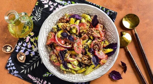 Описание: Томат (помидор) 300 гОгурец 300 гПетрушка 10 гБазилик свежий 10 гЛук красный 60 гСтручковый перец острый 20 гУксус белый винный 20 гМасло подсолнечное 30 гГрецкий орех 100 гУцхо-сунели 4 гШафран имеретинский (бархатцы) 4 гСольПомидоры разрежьте пополам, удалите плотные части со стороны плодоножек. Нарежьте томаты дольками. Огурцы очистите от кожицы и нарежьте ломтиками толщиной 7–10 мм. Сложите в салатник.Чищеные грецкие орехи проверьте на отсутствие перегородок. Часть орешков оставьте для украшения. Остальные истолките в ступке пестиком в мелкую крошку. Другой вариант: положите орехи в полиэтиленовый пакет, оберните его кухонным полотенцем и раздробите орехи молотком для мяса или прокатайте скалкой.Красный салатный лук нарежьте тонкими кольцами или полукольцами. Острый зеленый перец измельчите. Нарубите зелень петрушки, порвите на крупные кусочки листья базилика. Также переложите в салатник.Смешайте дробленые орехи с имеретинским шафраном и уцхо-сунели. Высыпьте смесь в салат. Заправьте грузинский салат белыми винным уксусом и кахетинским маслом, посолите по вкусу. Перемешайте и подавайте, украсив листочками базилика и половинками орехов.КСТАТИКахетинское масло — это густое подсолнечное масло с насыщенным цветом и выразительным вкусом. Вместо него вы можете использовать фермерское нерафинированное подсолнечное масло с ярким запахом.ХОЗЯЙКЕ НА ЗАМЕТКУВ этом авторском варианте рецепта грузинского салата отсутствует чеснок. Но в традиционном варианте он есть. Вы можете сделать соус-заправку из грецких орехов с чесноком: измельчить орехи в пасту вместе с парой зубчиков, добавить специи, уксус и немного воды — до консистенции сметаны. Заправьте салат соусом, сверху посыпьте дроблеными орехами.