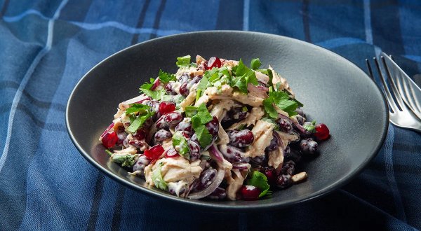 Описание: Консервированная красная фасоль - 1 банкаФиле курицы - 200 гКрасная луковица - 1 шт.1 большой гранатРубленные грецкие орехи - 1/2 стаканаНебольшой пучок кинзыЧеснок - 3 зубчикаХмели-сунелиМолотая гвоздика - 1/4 ч.л.Красный бальзамический уксус - 1 ст.л.Растительное масло для заправки - 15 гЧтобы приготовить грузинский салат с фасолью и курицей, подготовьте все ингредиенты. Предварительно отваренное куриное филе без кожи порвите руками на волокна.Очищенные грецкие орехи при необходимости освободите от перепонок - в салате это совсем лишнее. Слегка обжарьте и крупно порубите. Гранат помойте, очистите от кожуры и разберите на зерна. Несколько зернышек оставьте для украшения.Репчатый лук очистите и нарежьте тонкими полукольцами. Если не любите, когда лук в салате горчит, ошпарьте его кипятком или нарежьте помельче - так острый луковый вкус будет меньше чувствоваться.Чеснок очистите от шелухи и мелко порубите. Кинзу промойте, слегка обсушите на бумажном полотенце и также мелко порубите. Слейте сок из банки с фасолью.Сложите все ингредиенты в блюдо для подачи, посолите по вкусу, добавьте гвоздику и хмели-сунели . Заправьте салат растительным маслом, смешанным с бальзамическим уксусом. Перед подачей украсьте грузинский салат зернами граната.ХОЗЯЙКЕ НА ЗАМЕТКУНе выливайте жидкость из-под консервированной фасоли. Ее можно использовать, как растительную замену яичным белкам в приготовлении, например, майонеза, десертов типа зефира или безе, муссов и других блюд.КСТАТИГрузинский салат можно приготовить из куриных бедрышек без кожи - они более жирные, чем куриное филе. Но если вы остановили свой выбор на грудках, сварите их с добавлением пряностей, добавив, например, душистый или черный перец горошком и лавровый лист.