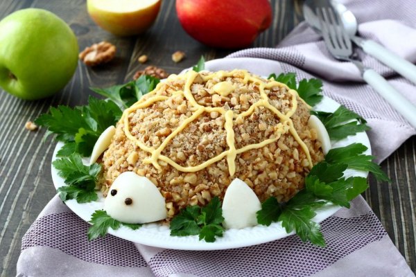 Описание: Яйцо куриное 4 шт.копченое куриное мясо 150 гЛук порей пучокЯблоко сладкое 2 шт.100 г сыр твёрдый150 г грецких ореховСалат листовойМайонезПредварительно промываем и отвариваем яйца и курицу до готовности.На круглое неглубокое блюдо выкладываем ровным не толстым слоем листы салата, заранее помытые и просушенные, на которые размещаем следующие слои в виде холмика, изображающего панцирь черепашки:- Первым слоем выкладываем натертые на средней терке яичные белки- Вторым слоем выкладываем мелко нарезанное в виде кубиков куриное мясо, заранее отваренное- Покрываем ровным слоем майонеза- Выкладываем лук порей, порезанный кольцами- Натертые кислые яблоки выкладываем пятым слоем- Вновь смазываем все майонезом и аккуратно разравниваем- Посыпаем равномерно натертым сыром- Выкладываем измельченные желтки яичные, которые смазываем сверху майонезом- Последний, завершающий слой – грецкие орехи, которые посыпаем ровным слоем по всей поверхностиПодошел этап, наверное, самый интересный – украшение. Формируем голову черепахи из яйца, также можно при помощи зелени, ломтиков морковки и др. подручных ингредиентов соорудить красивую рожицу. Ножки изготовляем из грецких орехов. Сетку панциря рисуем при помощи майонеза и приукрашиваем его кольцами из лука.