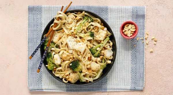 Описание: 30 минутДля приготовления 4 порций нужно:филе трески — 400 глапша удон — 300 гброкколи — 300 гсоус терияки — 6 ст. л.арахис — 50 гсольсвежемолотый черный перецНарежьте филе трески небольшими кубиками, переложите в миску. Добавьте 3 ст. л. соуса терияки, посолите, приправьте перцем и перемешайте. Оставьте мариноваться на 15 минут.Разберите брокколи на небольшие соцветия, отварите в подсоленной воде в течение 5 минут после закипания. Откиньте на дуршлаг.Приготовьте лапшу удон согласно инструкции на упаковке. В воке или в сковороде разогрейте растительное масло. Обжарьте треску до золотистого цвета, 5 минут.Добавьте к рыбе лапшу и брокколи, влейте 3 ст. л. соуса терияки и прогревайте еще примерно 2 минуты.Разложите лапшу по тарелкам. Посыпьте крупно нарубленным арахисом и сразу подавайте на стол.Полезный советЕсли любите острое, то в блюдо можно добавить несколько капель соуса шрирача или пасту кочуджан.