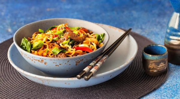 Описание: 40 минутДля приготовления 5 порций нужно:говядина, желательно толстый край — 400 глапша из картофельного крахмала или удон — 250 гкрупная морковь — 1 шт.сладкий красный перец — 1 шт.грибы шиитаке — 6 шт.шпинат — 3 горстибелый лук (маленький) — 1 шт.чеснок — 3 зубчикакунжутное масло — 1–2 ч. л.растительное масложареные семена кунжутазеленый лукДля маринада:соевый соус — 1 ст. л.чеснок — 1 зубчикрисовое вино — 1 ч. л.темное кунжутное масло — 1 ч. л.свежемолотый черный перецДля соуса:соевый соус — 4 ст. л.мёд — 2 ст. л.темное кунжутное масло — 1 ст. л.Нарежьте мясо тонкими полосками, поперчите. Измельченный чеснок смешайте с соевым соусом, вином и кунжутным маслом. Положите мясо в маринад и немного помните. Затяните пищевой пленкой, отставьте в сторону.Лук нарежьте тонкими полукольцами, чеснок порубите. Морковь и сладкий перец нарежьте тонкой соломкой. У грибов удалите ножки, шляпки нарежьте ломтиками.Сварите лапшу согласно инструкции на упаковке. Откиньте на дуршлаг, бульон сохраните. Переложите лапшу в большую миску, добавьте кунжутное масло, хорошо перемешайте руками, чтобы лапша не слиплась.Соедините все ингредиенты для соуса, тщательно перемешайте.Разогрейте на сильном огне 1 ст. л. растительного масла в большой сковороде или в воке. Положите мясо, жарьте 4–5 минут, периодически помешивая, до готовности. Переложите на тарелку.Уменьшите огонь до среднего. Добавьте 1 ст. л. масла и обжарьте лук, 3 минуты. Периодически помешивайте. Переложите лук к лапше. Добавляйте масло и по отдельности обжаривайте по 3 минуты грибы, сладкий перец, морковь и чеснок, приправляйте солью и перцем. Овощи должны оставаться слегка хрустящими. Добавьте в сковороду шпинат и 50–60 мл бульона, готовьте 2–3 минуты.Соедините лапшу со всеми овощами и мясом, добавьте соус. Поперчите. Посыпьте нарезанным зеленым луком и кунжутом. Сразу подавайте на стол.